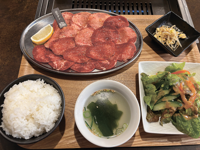 同店の看板メニューになっているのが「牛タン」と「ハラミ」。この牛タン、ハラミを使ったランチメニューが充実。一番人気の「並牛タン定食」(1490円)は、皿いっぱいに広がる牛タンが200㌘とボリュームたっぷり。「厚切り牛タン定食」(1705円)の「厚切りハラミ定食」(2860円)は、文字通り、その分厚さが自慢で、焼いた時の香ばしさと中のジューシーさが味わえる。ランチメニューは土・日曜日も提供しており、ファミリーにも人気だ。