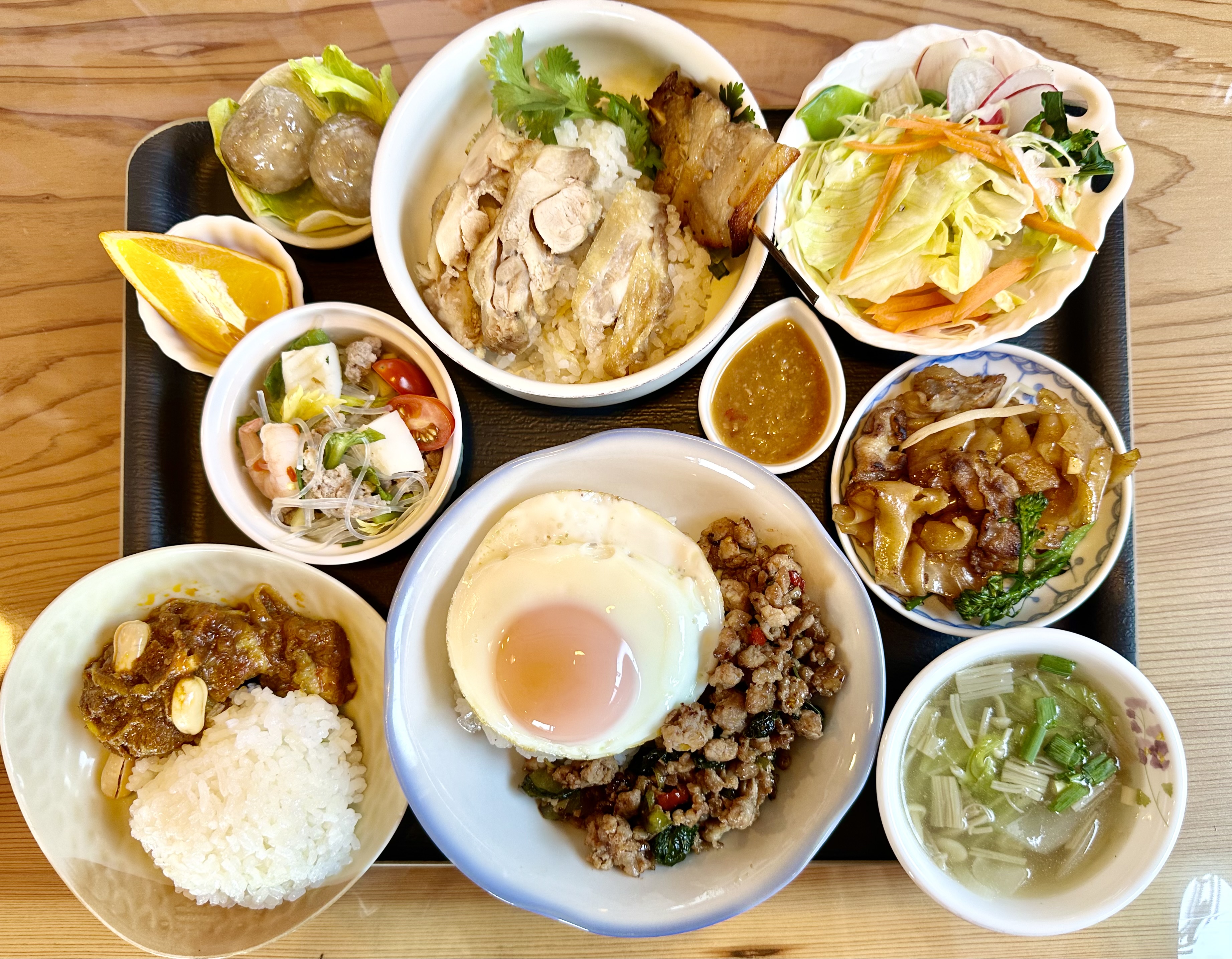 タイの家庭料理「ガパオライス」をメインに販売するキッチン。ご飯のすすむ味付けは、癖になると人気です。様々な料理を一度に楽しめる「おもてなしワンプレート」(1080円)はお持ち帰りもでき、オススメ。駐車場は荒町・与良町信号横の共同駐車場をご利用ください。
